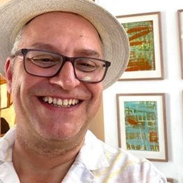 John Duke artwork is very colourful, textured with use of layer upon layer painting, masking taping and using silk velvet in his wearable art. His favourite part of being a human is making a shy person smile.